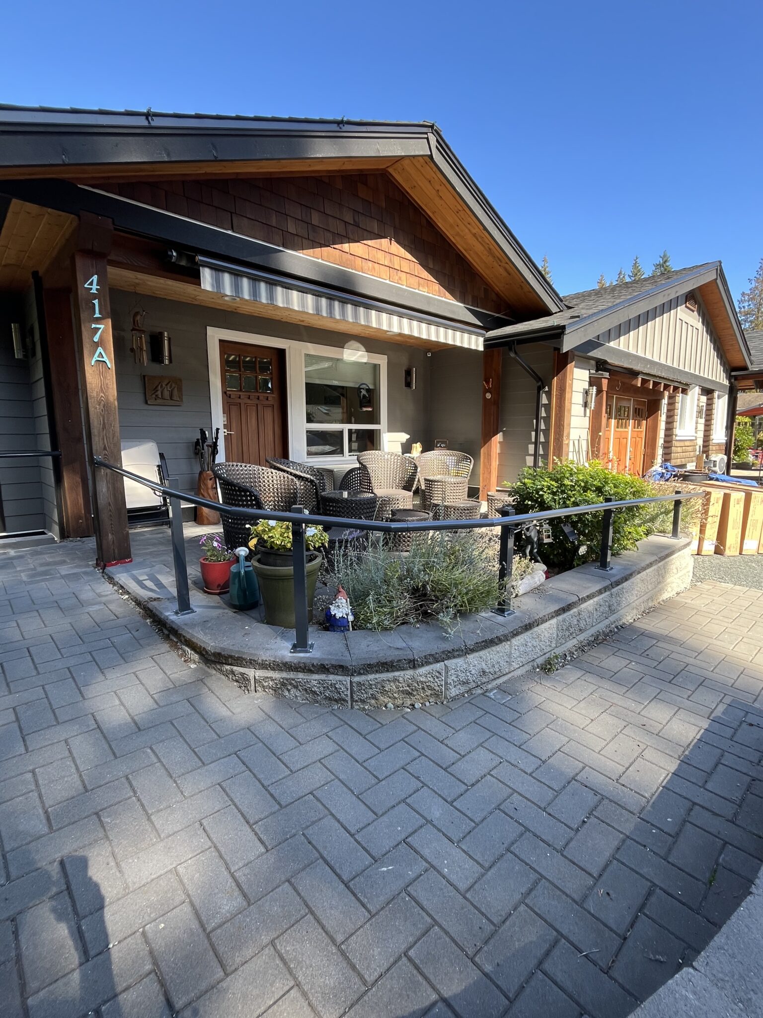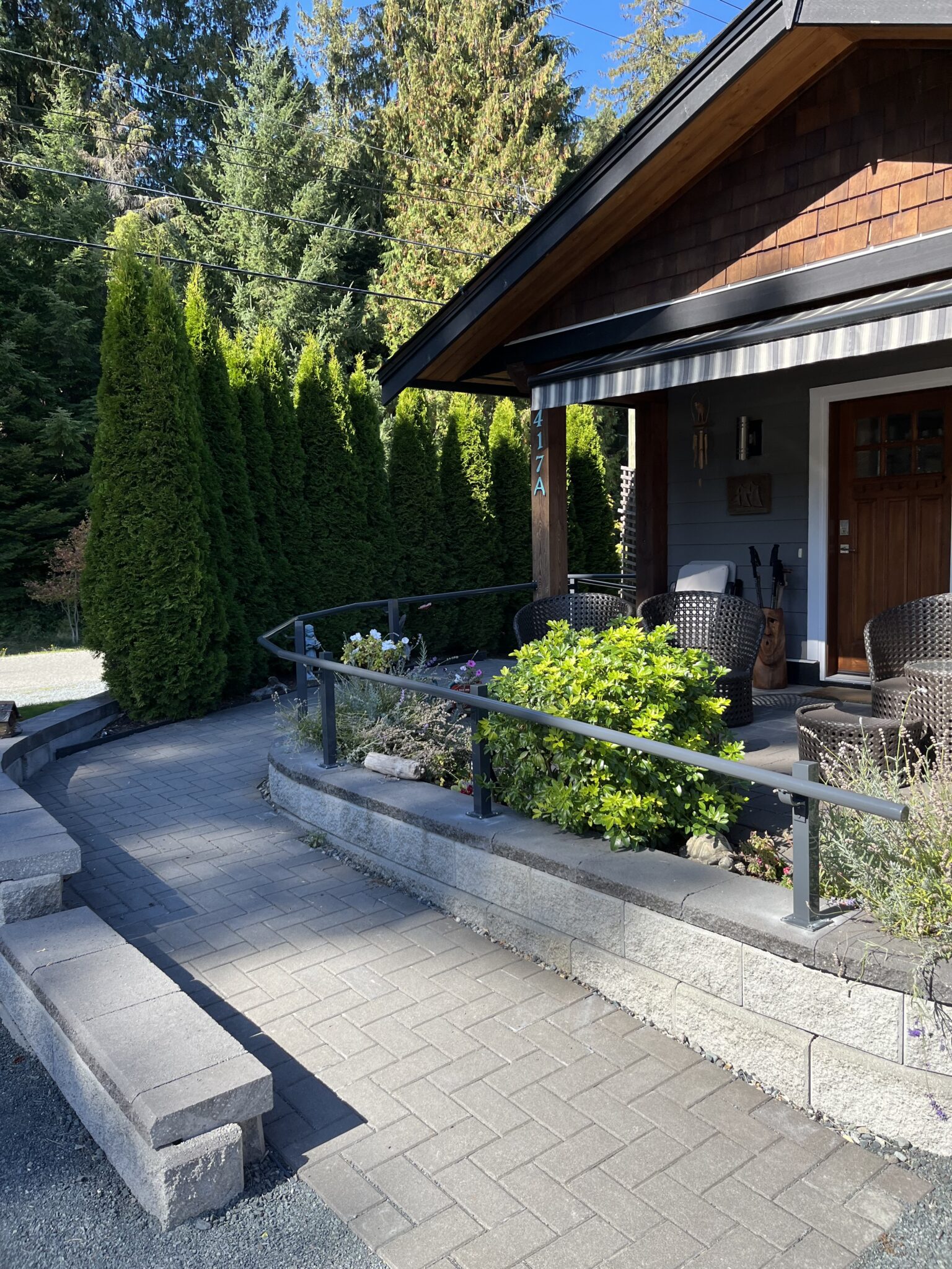 This Qualicum Beach, BC home features a custom aluminum handrail system designed to provide comfortable, secure access along the front walkway and side path. The powder-coated posts and continuous top rail create a clean, modern look that complements the home’s exterior.