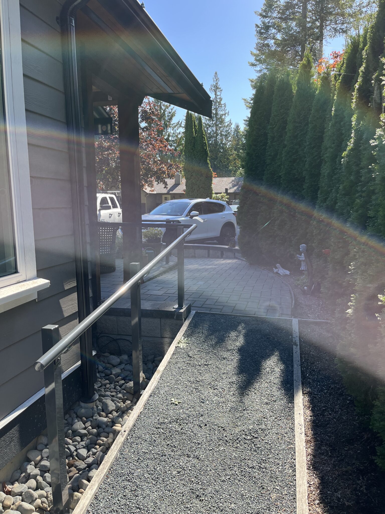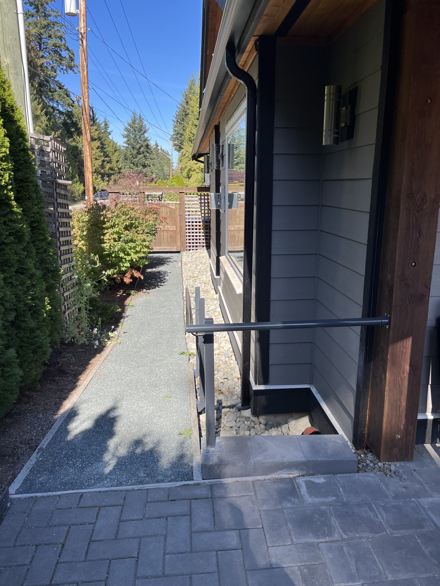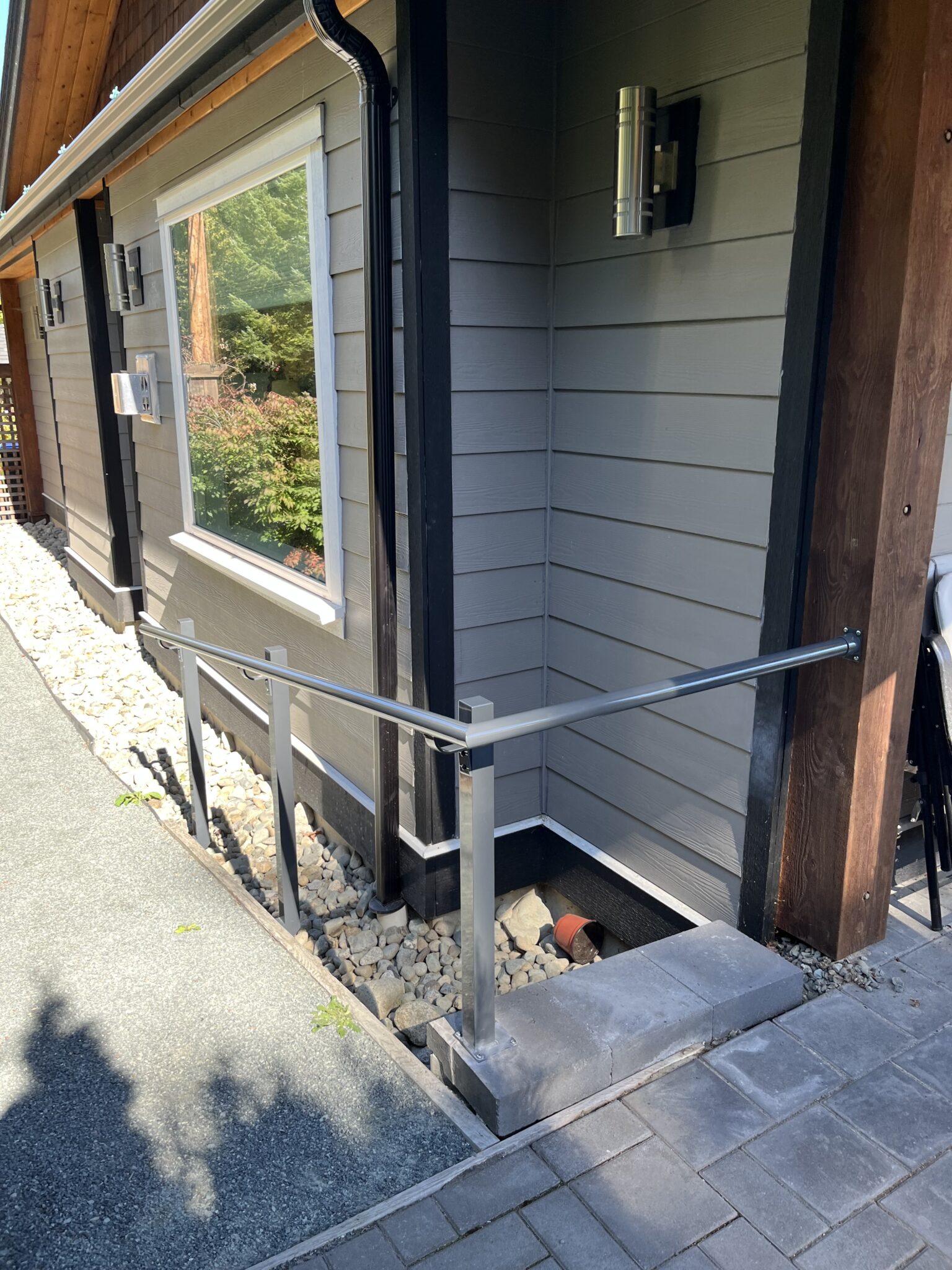 Additional handrails were added along the narrow side pathway, following the slope and grade changes with custom-mounted posts for consistent support.