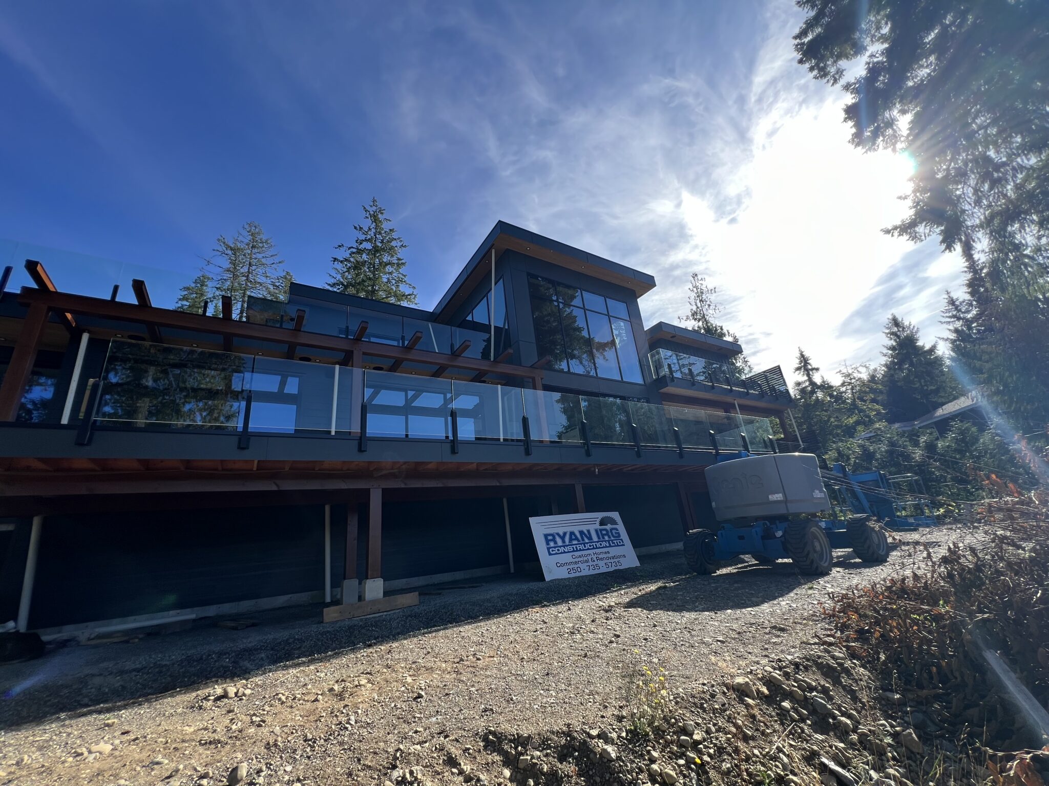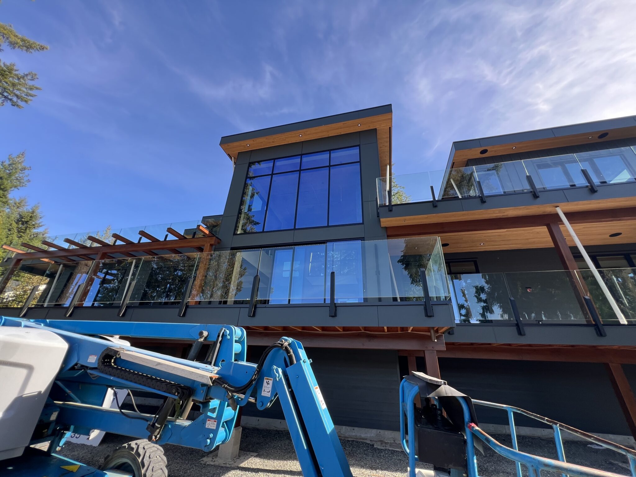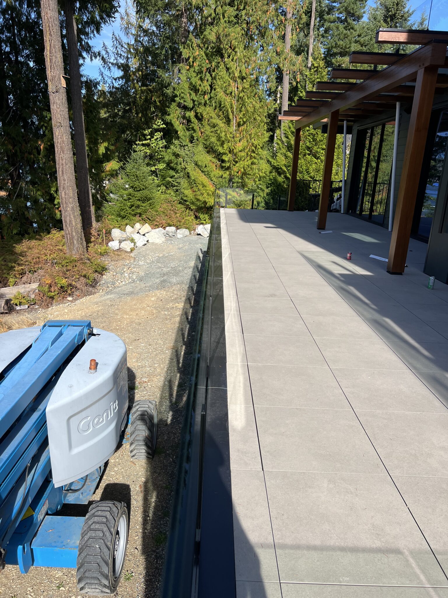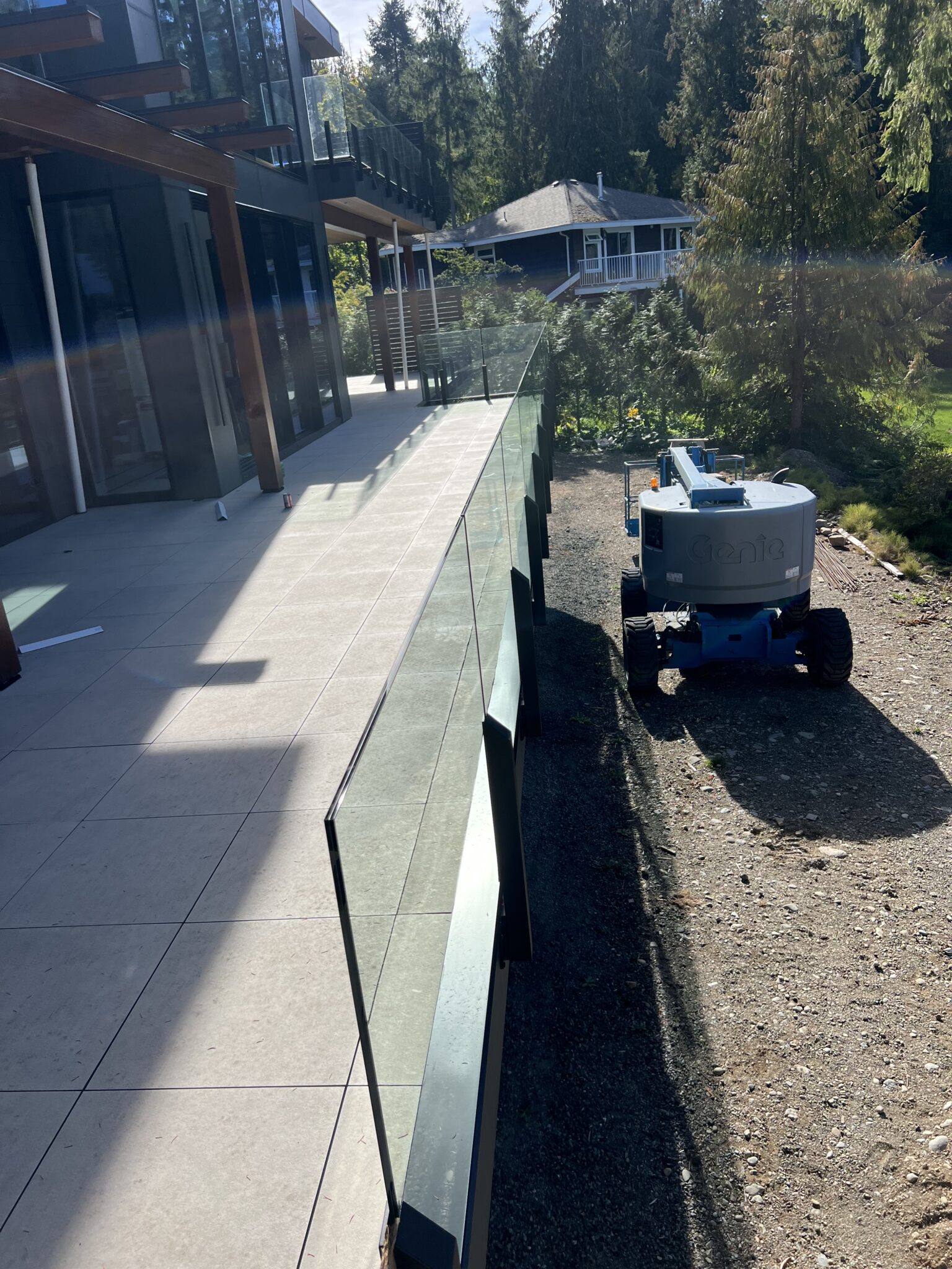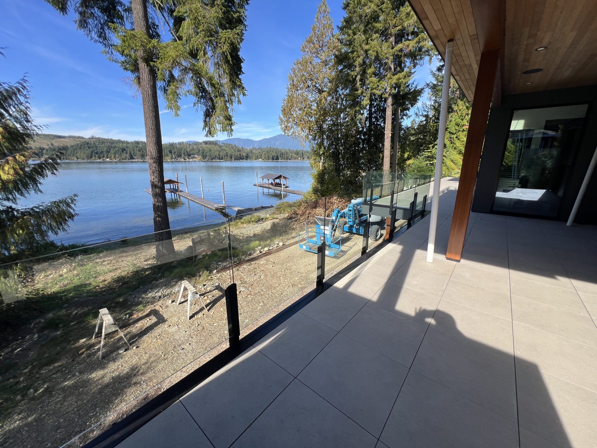 This Sproat Lake home features a custom glass railing system designed to maximize panoramic views across the water. The clear tempered glass and slim aluminum posts create a clean, modern barrier that provides safety without interrupting the landscape. Installed along the full patio perimeter, the system maintains an open visual connection to the lake and surrounding forest.