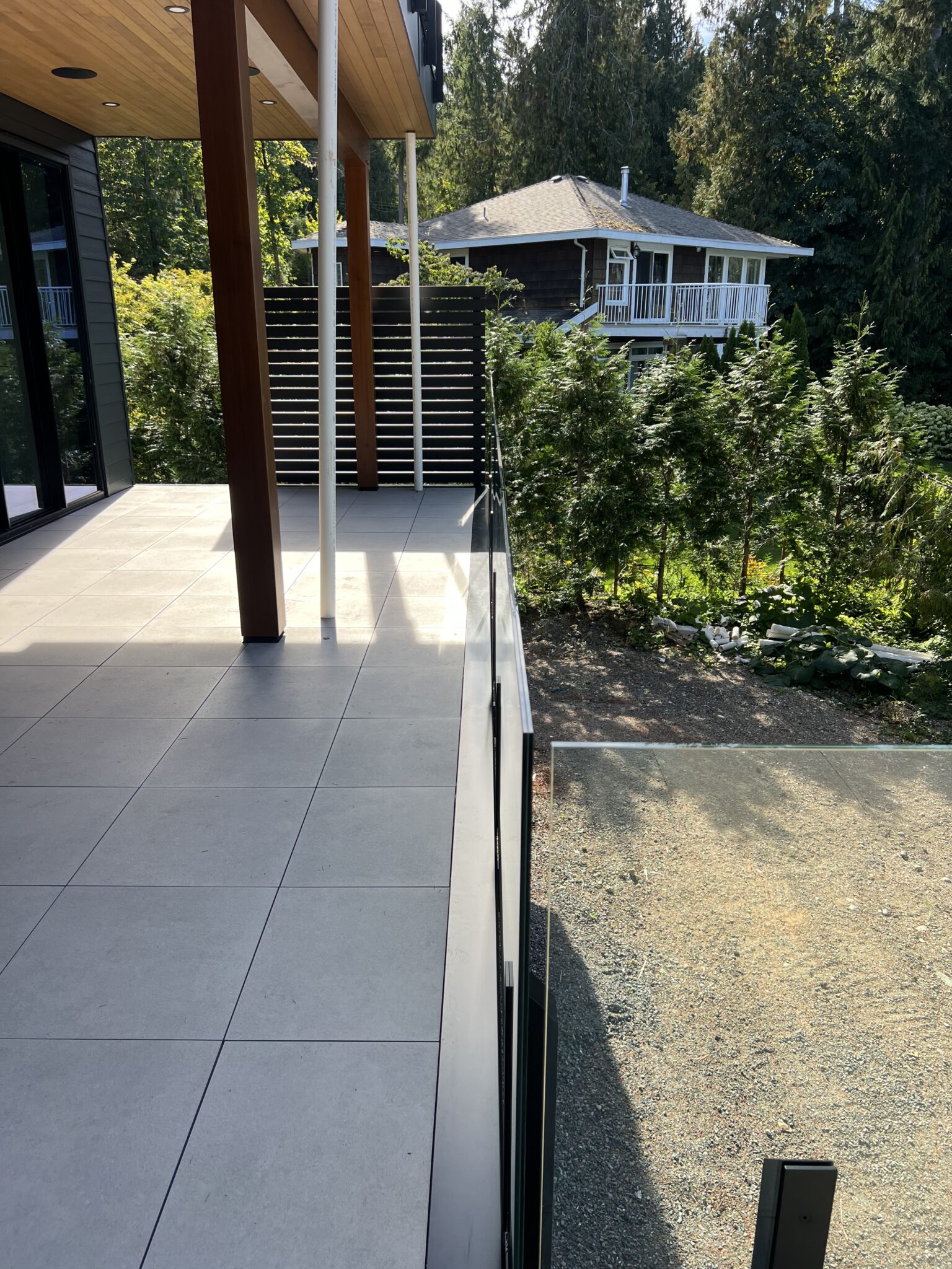 The railing system uses 12 mm tempered glass set into a recessed aluminum base track, allowing each panel to sit flush with the deck for a seamless architectural finish. The low-profile black posts add subtle structure while complementing the home’s contemporary exterior.